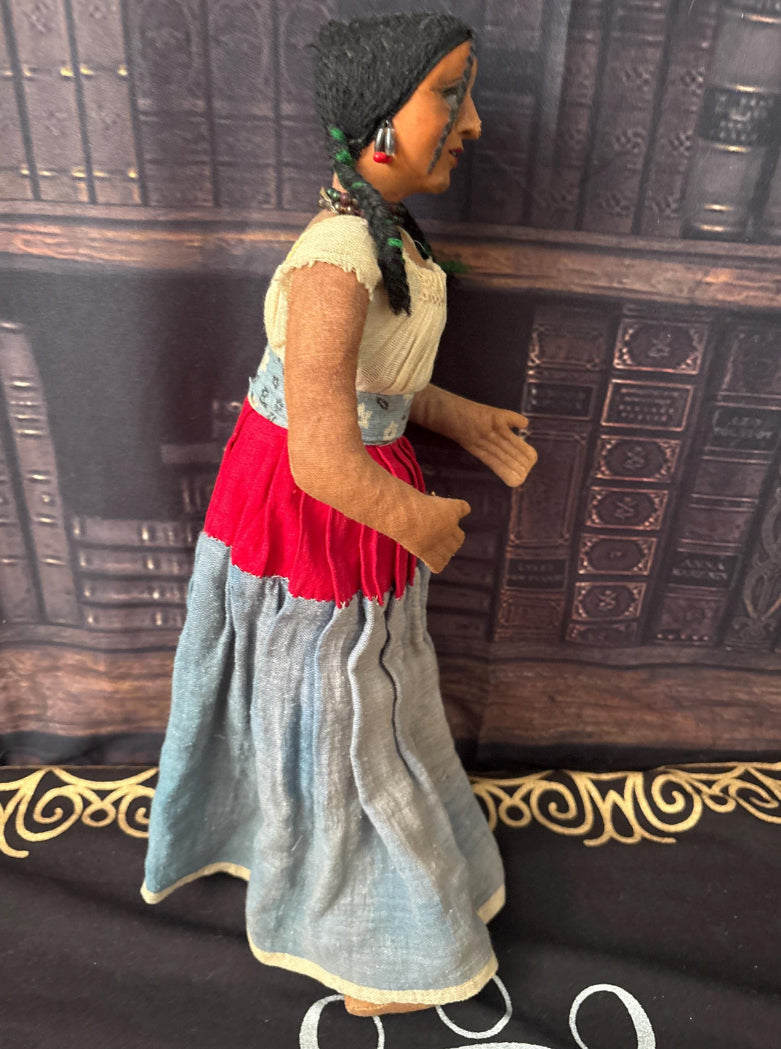 Her vessel is a rare find, well kept vintage doll, 16” tall with a cloth body. She has not been groomed. Her vessel is creepy and unusually charged with her energy.